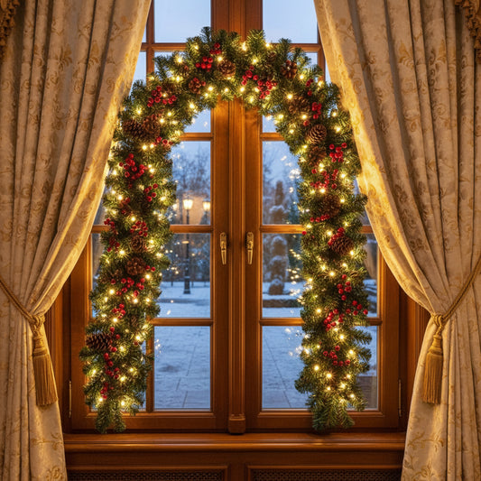 Ghirlanda de Crăciun Imperială, decorată cu Fundițe conuri, merișoar si instalație LED, 270cm