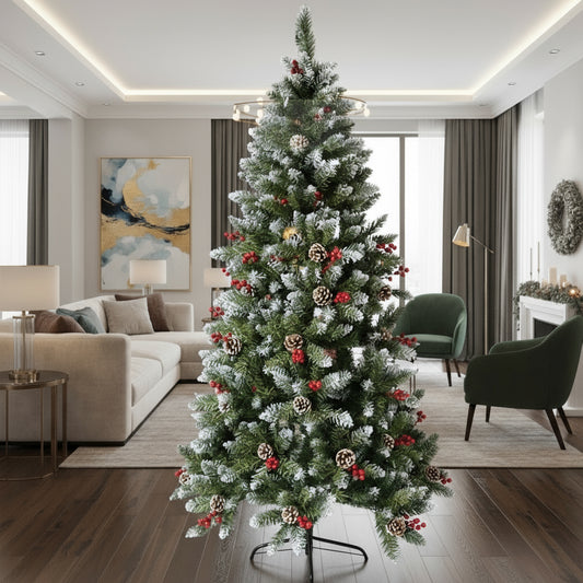 Brad artificial tip nins, vârfuri 2D, decorat cu conuri de pin , înălțime 150cm, 319 ramuri, suport metalic inclus