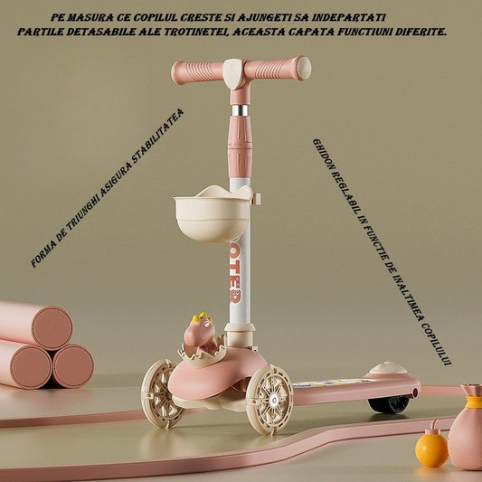 Trotineta Multifunctionala 3 in 1, pentru Copii, 1-7 Ani, cu Lumini si Muzica, Reglabil 360, Pliere Usoara, Reglarea Inaltimii, Model Dinozaur, Alb/Roz