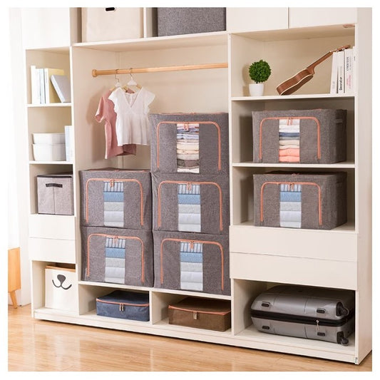 Cutie depozitare pliabila 100L din bumbac si in, 60x42x40cm , cu fereastra frontală , 2 uși de acces cu fermoar bidirectional si cadru metalic Model 2