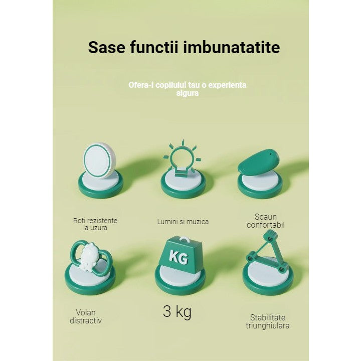 Bicicleta Pentru Copii, Flippy, Fara Pedale, Cu Patru Roti, Din Plastic Rezistent, Fara BPA, Cu Muzica Si Lumini, Model Dinozaur, 50x27x40 Cm, Verde este special conceputa pentru a oferi stabilitate, siguranta si confort extraordinar la condus, atat acasa, cat si in exterior, iar structura usoara si durabila plastic solid de inalta calitate va functiona in toate conditiile. Cele patru roti ofera o stabilitate mai mare si in acelasi timp, rulare usoara, astfel incat micul nostru sofer nu oboseste foarte repede. Invelisul din silicon al rotilor garanteaza o utilizare silentioasa.