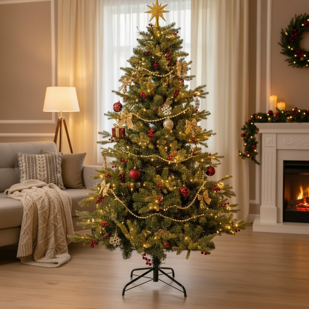 Brad artificial cu vârfuri 2D, decorat cu conuri si merișoare ,210 cm înălțime , 137 cm diametru, 1172 ramuri, suport metalic inclus
