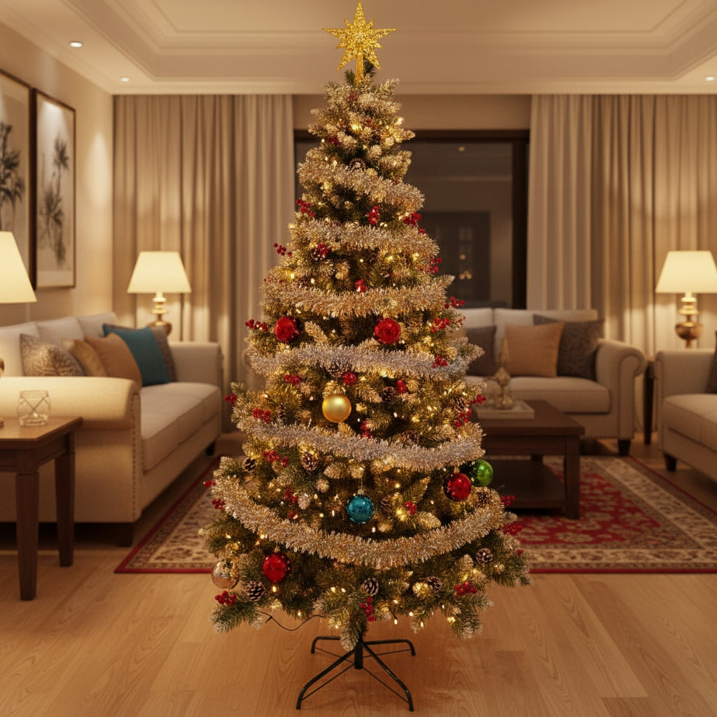 Brad artificial tip nins, vârfuri 2D, decorat cu conuri de pin , înălțime 150cm, 319 ramuri, suport metalic inclus