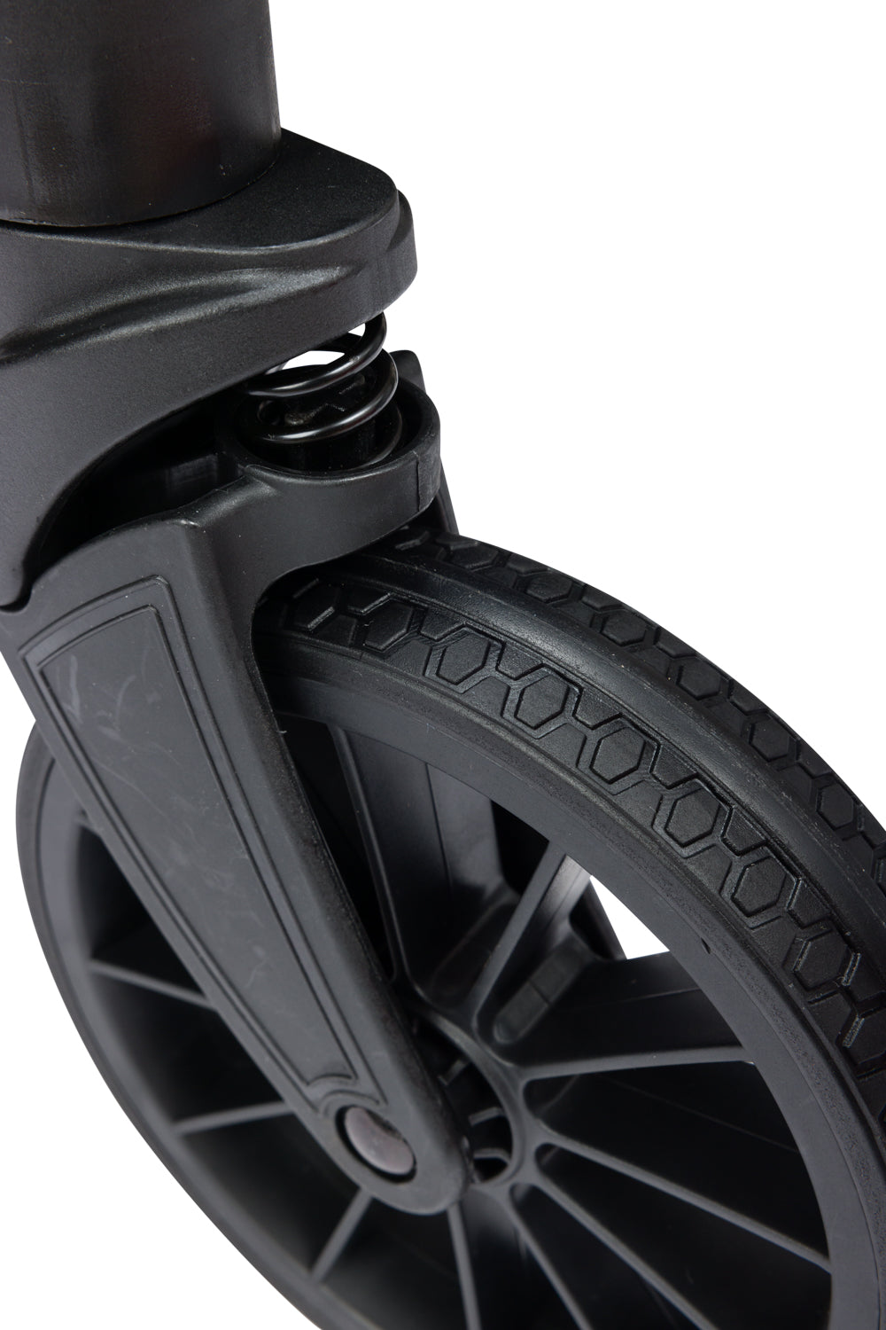 Dimensiunea compactă și greutatea redusă a căruciorului (8,5 kg) sunt combinate cu roțile mari din PU (diametrul de 18 cm pentru roțile din față prevăzute cu sistem de amortizare a șocurilor și 24 cm pentru roțile din spate), micuțul dumneavoastră fiind în absolut confort pe tot parcursul anului, indiferent de suprafața de rulare.