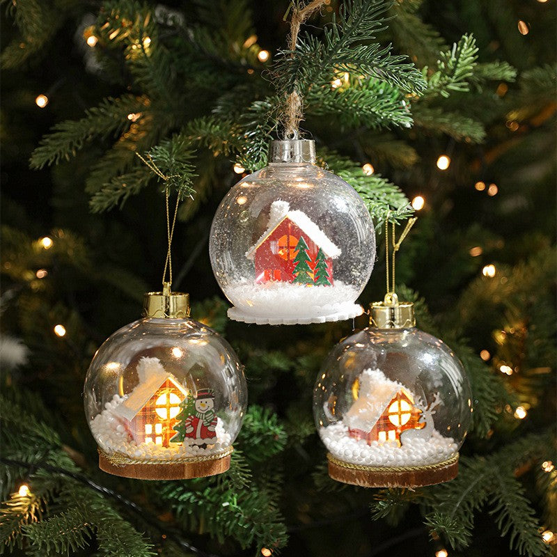 Glob pentru Bradul de Craciun LED, Model A, Glob Transparent cu Figurina Casa si Braduti iluminat LED, Diametrul 10 cm, Baza Solida, Transparent