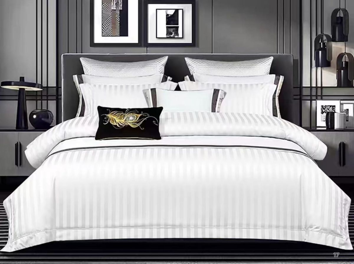 Lenjerie de pat, 6 piese, cu dungi, din damasc - Alb