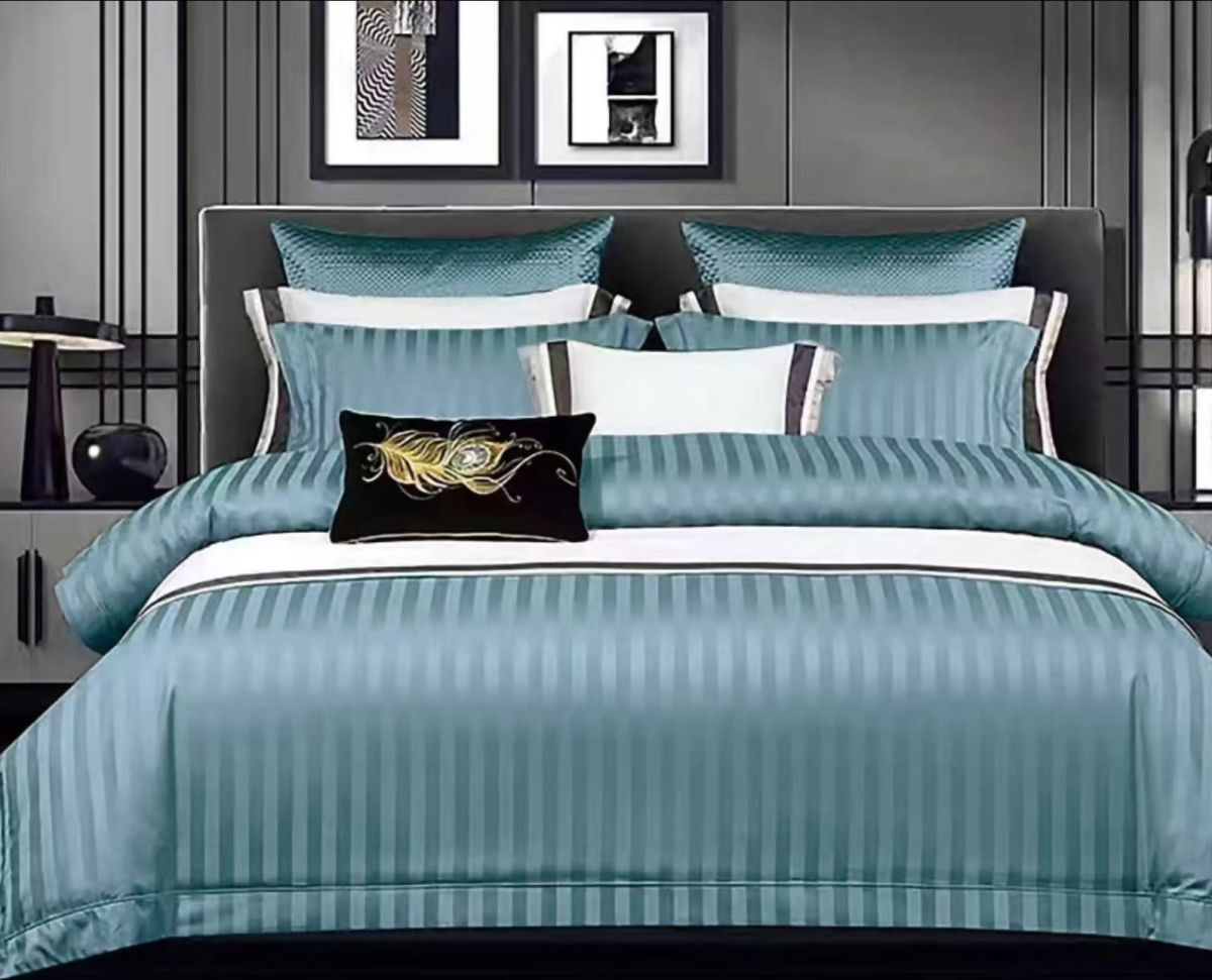 Lenjerie de pat, 6 piese, cu dungi, din damasc - Albastru