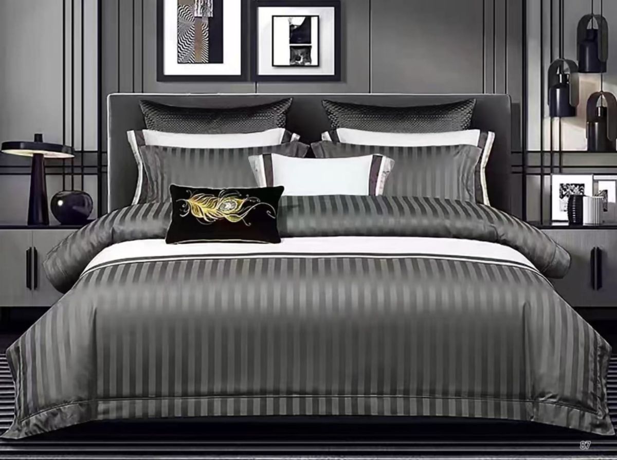 Lenjerie de pat, 6 piese, cu dungi, din damasc -Kaki