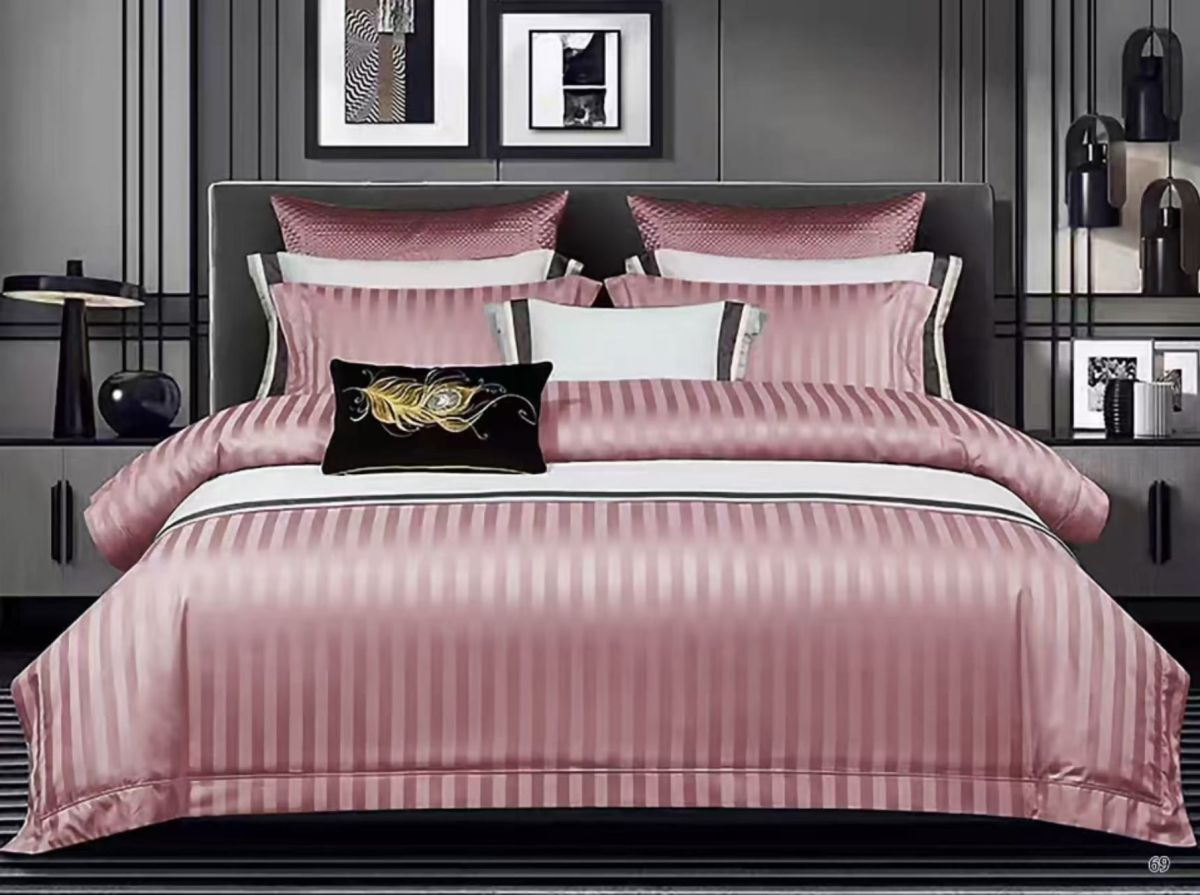 Lenjerie de pat, 6 piese, cu dungi, din damasc -Roz