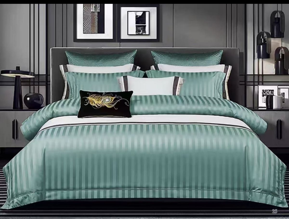 Lenjerie de pat, 6 piese, cu dungi, din damasc -Verde