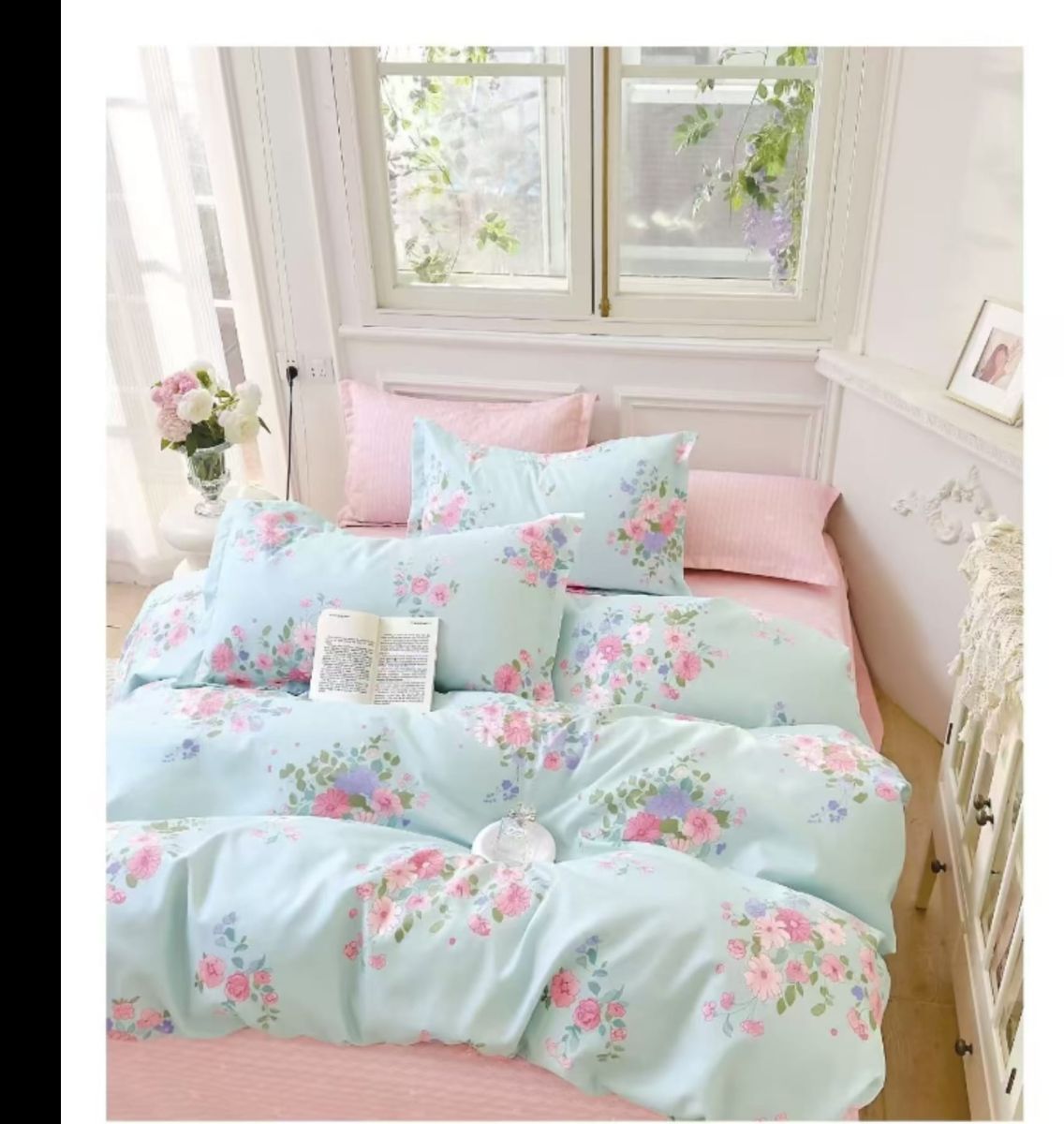 Lenjerie de pat, 6 piese, din bumbac satinat, cu model imprimat Bleu