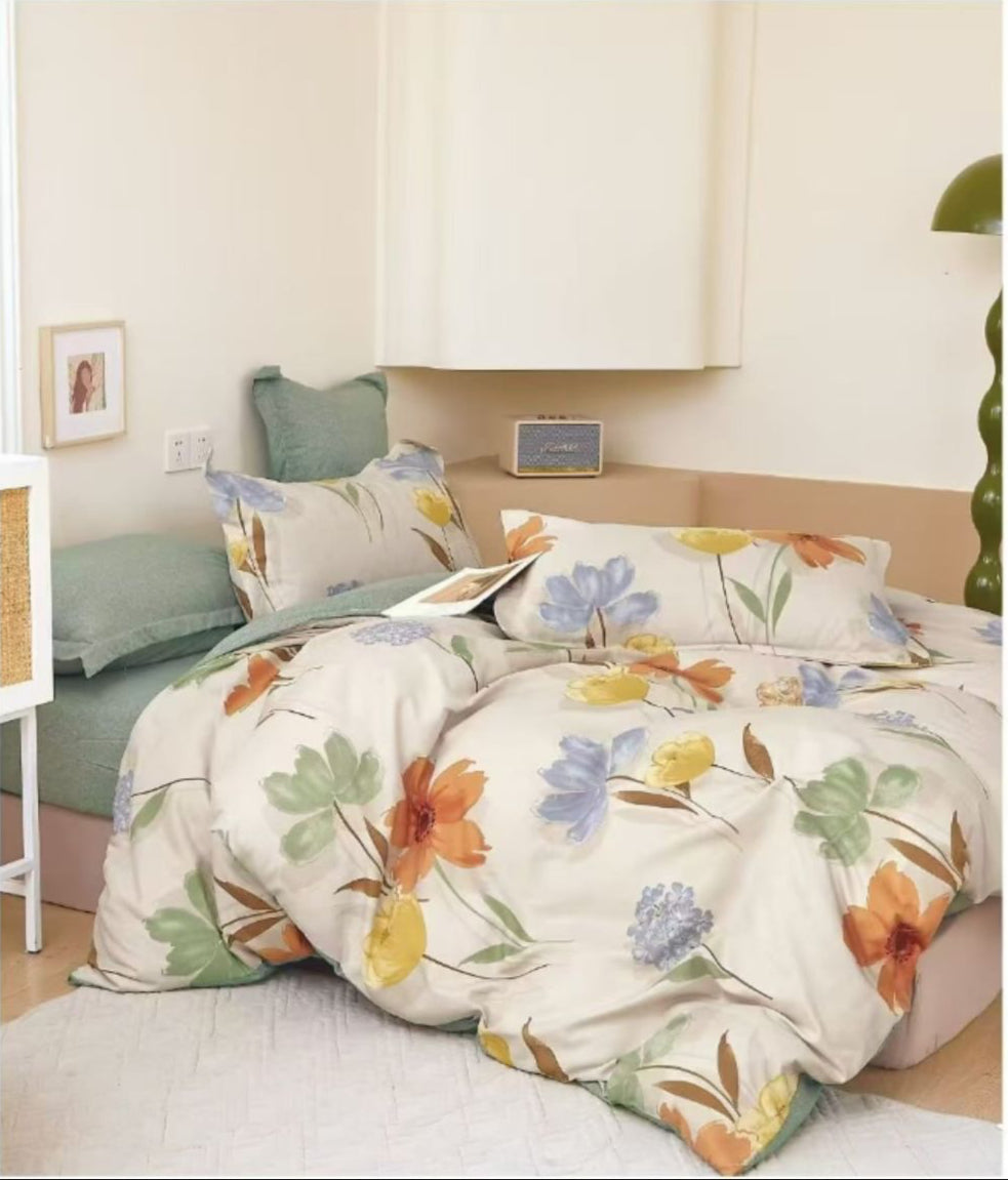 Lenjerie de pat, 6 piese, din bumbac satinat, cu model imprimat Crem