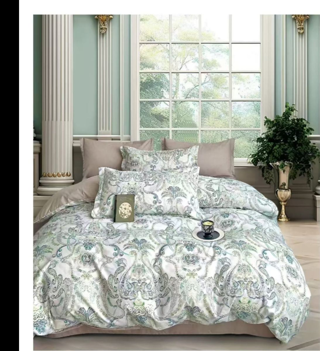 Lenjerie de pat, 6 piese, din bumbac satinat, cu model imprimat Verde