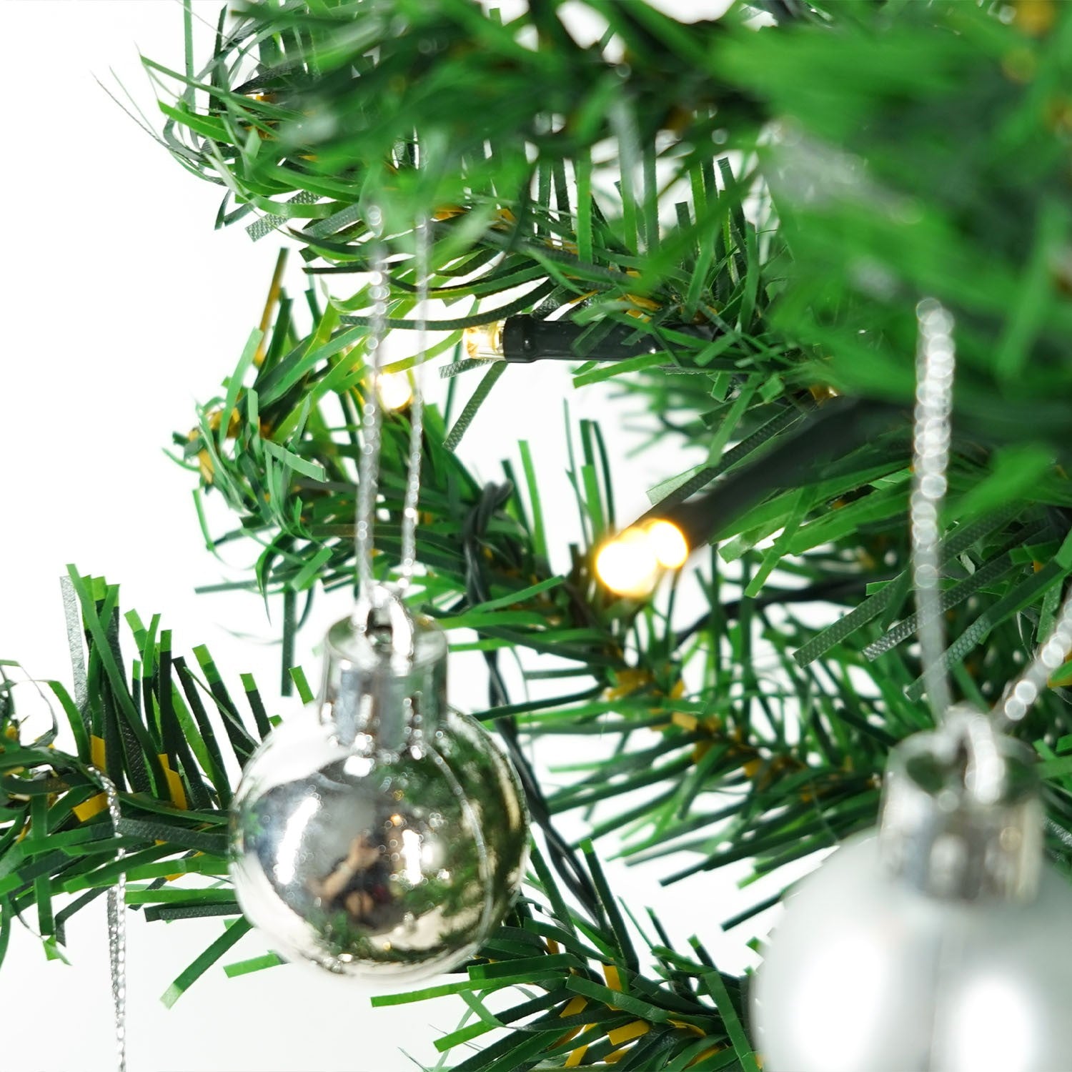 BRAD ARTIFICIAL IMPODOBIT, 60 CM, SUPORT PLASTIC CU INSTALATIE LUMINOASA 20 LED ALB CALD + 20 GLOBURI ARGINTII INCLUSE