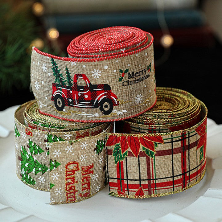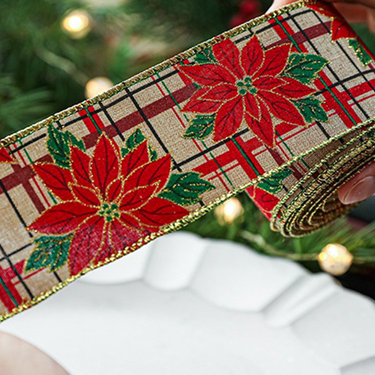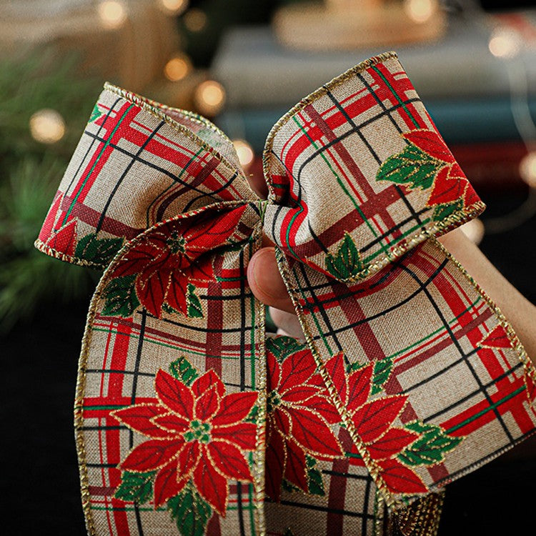Panglica de Craciun pentru Decor Brad, Panglica Decorativa de Craciun pentru Funde, Imprimeu Floare Rosie, 200 x 6.3 m, Khaki Rosu